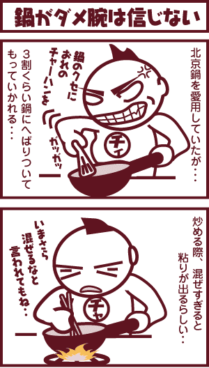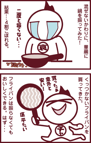 チャーハンを炒める際にとにかく鍋にへばりつく!という経験のある人も多いのでは?鍋をよく熱してから炒めるとか、逆に鍋底に押し付けるといい!とかありますが… いっそ、プロのように華麗に鍋を振って…大惨事。なんてこともよくある話。 結局のところ、くっつかない加工してあるフライパンを使えば、3倍美味しく作れます。