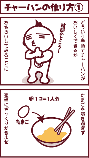 あらためて〝チャーハンを作り方〟をおさらい! 材料はどーすんだ?!っていう人は、第8話を参照。 まずは「たまご」から下ごしらえ。ご飯と一緒に炒めるなんて芸当は全く以てできないので、スクランブルエッグ状に炒めた「たまご」は一旦別なお皿に移しておきます。これ、大事です。 その2へ 続きます。