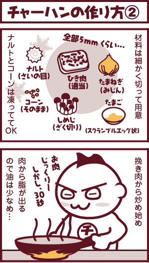 チャーハンの作り方のおさらい、その2です。その1を読んでいない人はその1へ。 ・材料はムラなく火が通るように、だいたい同じくらいの大きさに… (挽き肉の小さいのくらいだと小さすぎますが・・・適当に小さめです。) ・挽き肉から炒め始め、火が通ったくらいで他の具材を投入 ・他の具材に火が通ってきたら「味覇(ウェイパー)」投入します。 その3に続きます。
